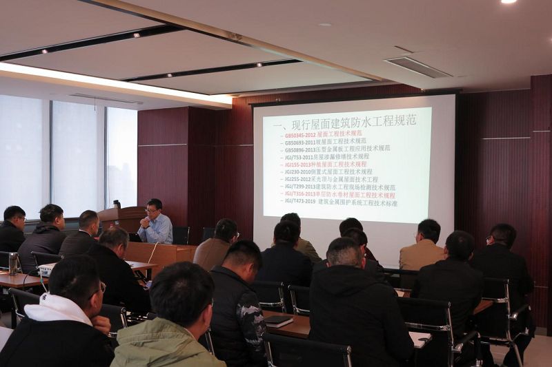 培訓(xùn)總時(shí)長約2小時(shí),邀請(qǐng)中國建材檢驗(yàn)認(rèn)證集團(tuán)蘇州有限公司的防水專家朱志遠(yuǎn)作為本次會(huì)議的主講嘉賓,旨在增強(qiáng)相關(guān)技術(shù)人員在實(shí)際防水工程中質(zhì)量控制,了解現(xiàn)行規(guī)范及行業(yè)趨勢(shì),提高防水意識(shí)。培訓(xùn)中,朱志遠(yuǎn)專家針對(duì)屋面防水材料及應(yīng)用、《屋面工程技術(shù)規(guī)范》、《坡屋面工程技術(shù)規(guī)范》、《種植屋面工程技術(shù)規(guī)程》、《單層防水卷材屋面工程技術(shù)規(guī)程》、施工技術(shù)和施工過程中易出現(xiàn)的問題和誤區(qū)進(jìn)行了詳細(xì)的培訓(xùn)講解。
