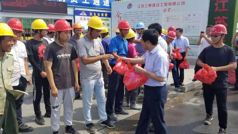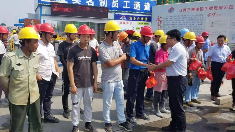 連日來,我市烈日當空,持續(xù)高溫,為改善夏季工作條件,對依舊堅持在烈日下工作的一線職工表達敬意和關(guān)懷,加強高溫期間職工勞動保護工作,推動企業(yè)落實防暑降溫措施,2019年8月7日上午,醫(yī)藥高新區(qū)組織部部長葛立網(wǎng),住建局局長朱葉青、副局長洪一琤在華信公司董事長張由鳳、總經(jīng)理楊鑌等一行的陪同下來到康澤花園一期、醫(yī)藥城小學(xué)項目現(xiàn)場,對現(xiàn)場工作人員進行高溫慰問,為這個炎熱的夏季送來清涼。