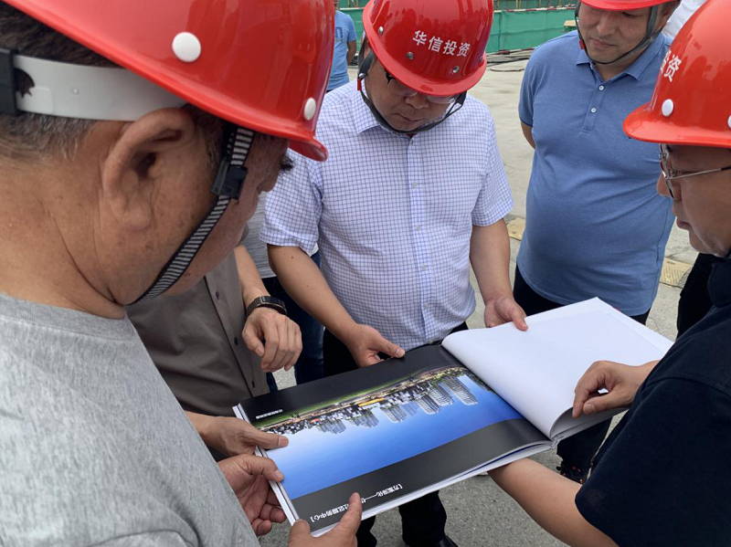 (圖:華信藥業(yè)投資有限公司董事長(zhǎng)張由鳳、總經(jīng)理?xiàng)铊\在外國(guó)語學(xué)校培訓(xùn)樓項(xiàng)目現(xiàn)場(chǎng)視察指導(dǎo)工作,項(xiàng)目二部部長(zhǎng)段曉軍作項(xiàng)目情況匯報(bào)。攝影:程玲)